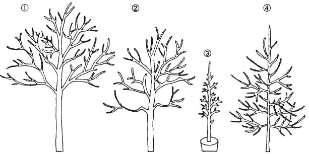 Принципиально любая форма кроны может быть сформирована на штамбе любой высоты, но здесь встает вопрос практической целесообразности. Так, например, у высоко- и полуштамбовых плодовых культур нецелесообразно формировать веретеновидную или плоскую форму кроны, и, напротив, разреженно-ярусная форма кроны, являющая собой пирамидальный силуэт, подходит практически для всех пород высоко-, низко- и полуштамбовых плодовых деревьев. Формирование кроны плодовых деревьев — процесс постепенный, он проходит в несколько этапов. Обрезка плодовых деревьев является сложным искусством управления жизнью дерева. С помощью частичного или полного удаления из кроны плодового дерева отдельных побегов и ветвей можно сформировать прочный скелет дерева с равномерным размещением ветвей в кроне, создать хорошие условия для развития всех ветвей без ущемления их друг другом или создания вынужденной конкуренции. При помощи грамотной обрезки можно создать условия для раннего вступления растения в стадию полноценного плодоношения, уменьшить его периодичность и получить оптимальные для породы, сорта и возраста растения урожаи качественных плодов. Первоначальный этап формирования кроны любого плодового дерева начинается уже с обрезки молодого саженца. Необходимость в обрезке возникает в первый же год после посадки дерева, так как при выкопке саженцев из питомника неизбежно удаляется часть корневой системы, оставшаяся часть не в состоянии в полной мере обеспечить все часги растения водой и питательными веществами. В результате возникает физиологический дисбаланс между подземной и надземной частями растения, который необходимо привести в соответствие путем первичной обрезки, которая уменьшает поверхность испарения и обеспечивает нормальный интенсивный рост саженца. При обрезке в первый год после посадки весной оставляют только хорошо сформировавшиеся и развитые ветви, из которых в будущем сформируется основа дерева и остов кроны. Необходимо оставить ветви, которые растут под прямым или близким к прямому углом, так как они обеспечивают наиболее прочное срастание кроны со стволом. Напротив, ветви, отходящие от ствола под прямым углом, необходимо удалить, так как в будущем при нагрузке под тяжестью плодов они могут обломиться. Верхние ветви укорачивают на 1/2 или 1/3 их начальной длины, нижние ветви укорачивают слабее или оставляют неукороченными. Укорачивание побегов у саженцев предполагает удаление верхушечных почек, которые распускаются первыми и образуют листья, что способствует раннему испарению влаги и истощению молодого дерева. Обрезку молодого дерева начинают с укорачивания центрального проводника, который срезают так, чтобы он был на 15—25 см выше остальных побегов, конкурирующий побег основного проводника вырезают на кольцо. У сортов Высота штамба плодовых деревьев 1. Высокоштамбо-вое дерево, высота штамба 160— 180 см. 2. Полуштамбовое дерево, высота штамба 120— 140см. 3. Низкоштамбовое дерево, высота штамба 80— 100 см. 4. Карликовое дерево, высота штамба менее 80 см Основные этапы формирования кроны плодового дерева путем обрезки 1. Обрезка саженца после посадки. 2. Обрезка молодого плодоносящего дерева в возрасте 5—7 лет. плодовых деревьев с компактной формой кроны проводник укорачивают слабее, а боковые побеги обрезают до внешней поч