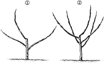 дельные ветки для регулирования их роста и придания правильного направления. Укорачивание применяют в основном на однолетних побегах. При этом степень укорачивания основных ветвей выбирают с учетом особенностей и силы роста дерева. Нужно внимательно следить за тем, чтобы крона не слишком загущалась, для чего применяют ее периодическое прореживание. При прореживании кроны взрослого дерева в первую очередь вырезают на кольцо усохшие, больные, поломанные, загущенные и растущие внутрь кроны ветви. Одновременно с обрезкой скелетных ветвей прореживают и укорачивают отдельные слабые, тонкие и оголенные плодоносные ветви. У стареющих деревьев постепенно прекращается рост ветвей даже при хорошем уходе, проявляется резко выраженная периодичность плодоношения, качество плодов снижается. В этот период развития дерева начинается усыха-ние окончаний скелетных ветвей и даже отмирание отдельных из них, начиная с нижних, ослабленных или сильно затененных. В нижней части кроны старого дерева у основания раз- ветвления основных скелетных ветвей первого порядка образуются волчковые побеги. Такие деревья обычно подвергают сильно укорачивающей омолаживающей обрезке. При омолаживании скелетные ветви укорачивают до зоны отрастания волчков, что составляет примерно 1/3 их длины. Одновременно с укорачиванием скелетных ветвей выполняют частичное слабое прореживание кроны, в основном удаляя засохшие, слабые и поломанные ветви. Крона плодового дерева должна: * быть прочной, устойчивой к выдерживанию больших объемов плодов и снега зимой; * быть удобной для ухода и сбора урожая; * иметь достаточное для получения высоких урожаев количество основных и обрастающих ветвей. Начальным и наиболее ответственным этапом формирования кроны плодовых деревьев является закладка основных ветвей. Расстояние между ветвями на штамбе При формировании кроны дерева необходимо следить, чтобы ветви не росли слишком скученно, что создает серьезную конкуренцию развитию каждой из них, а располагались на штамбе через сравнительно равные промежутки. 1. Мутовчатое образование ветвей на штамбе, ветви располагаются с минимальным разбегом, растут практически из одной точки, что затрудняет формирование скелета кроны. 2. Ветви располагаются на штамбе через равные промежутки, что дает возможность каждой из них равноценно развиться, покрыться обрастающими ветвями и создать прочный остов кроны Угол отхождения ветвей При формировании кроны исключительно важно учитывать и соблюдать угол отхождения ветвей от штамба. Оптимальный угол между отрастающей ветвью и штамбом находится в диапазоне от 45 до 90°. Ветвь справа слишком круто отходит от штамба вверх, что создает существенную опасность ее отламывания Выбор и заложение основных ветвей кроны у молодых деревьев в саду производится с целью формирования прочного остова плодового дерева, что является одним из главных условий его последующего успешного плодоношения. Закладка основных ветвей зависит от породы дерева, а также силы роста и ветвления определенного сорта, пробудимости почек, побегообразовательной способности и других биологических особенностей плодового дерева. Крона должна быть прочной, удобной для ухода и сбора урожая, иметь достаточное для получения высоких урожаев количество основных и обрастающих в